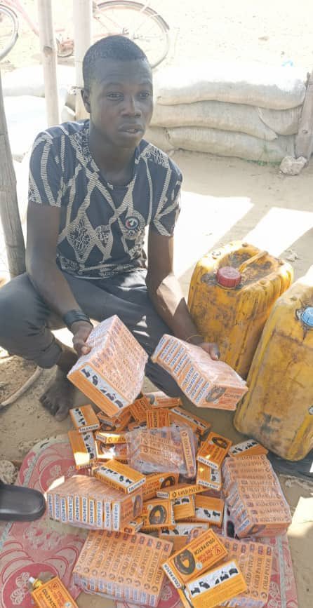 On October 2, troops of 24 Task Force Brigade in conjunction with members of the Civilian Joint Task Force (CJTF) and local hunters, apprehended one Abba Wakil, aged 18, with two jerricans of condemned engine oil and 100 pieces of quick patch.