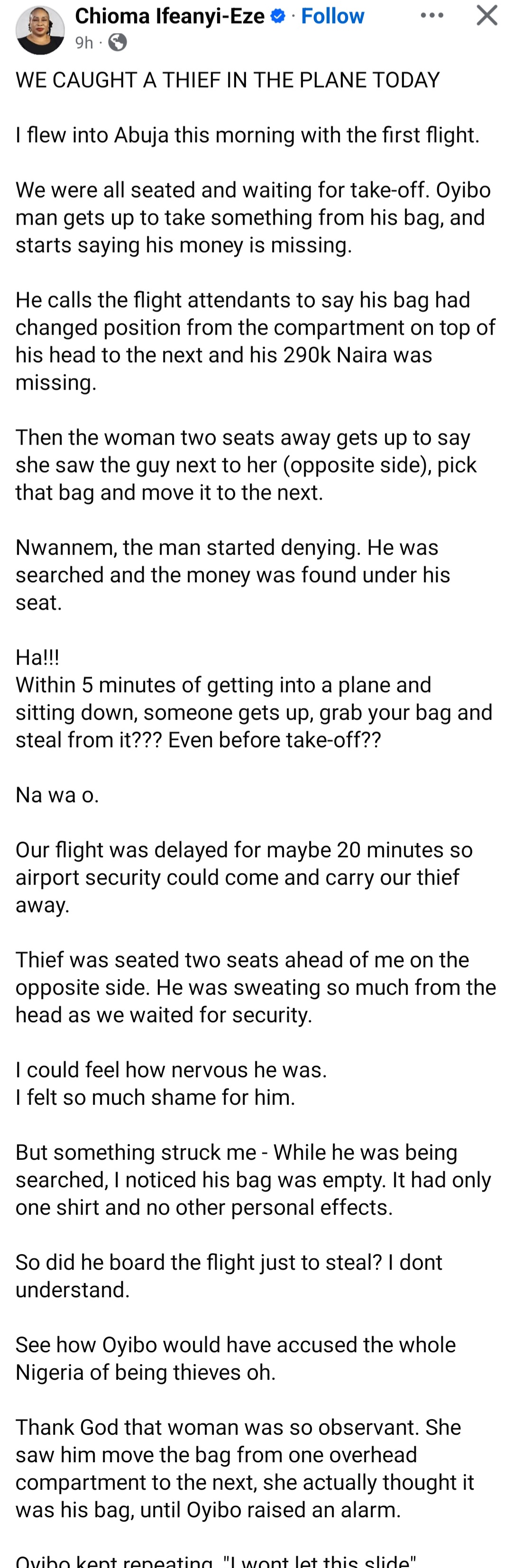 "Na wa o. Our flight was delayed for maybe 20 minutes so airport security could come and carry our thief away.