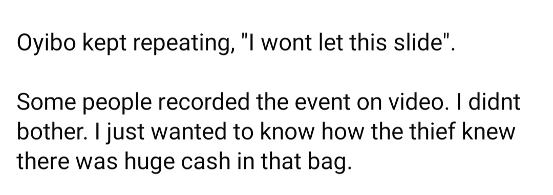 “Some people recorded the event on video. I didnt bother. I just wanted to know how the thief knew there was huge cash in that bag.”