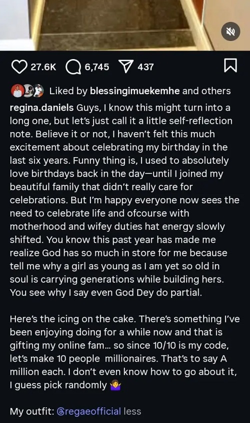 She announced her plan to do a N10m giveaway, writing: “Guys, I know this might turn into a long one, but let’s just call it a little self-reflection note. Believe it or not, I haven’t felt this much excitement about celebrating my birthday in the last six years. Funny thing is, I used to absolutely love birthdays back in the day-until I joined my beautiful family that didn’t really care for celebrations.