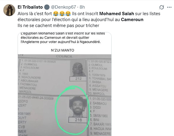 Cameroonians have been left in shock after, the face of Egyptian football star Mohamed Salah, appeared on the list of registered voters at the Ngaoundéré III polling station.