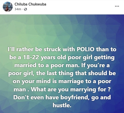 “I’ll rather be struck with POLIO than to be a 18-22 years old poor girl getting married to a poor man. If you’re a poor girl, the last thing that should be on your mind is marriage to a poor man . What are you marrying for ? Don’t even have boyfriend, go and hustle,” she wrote.