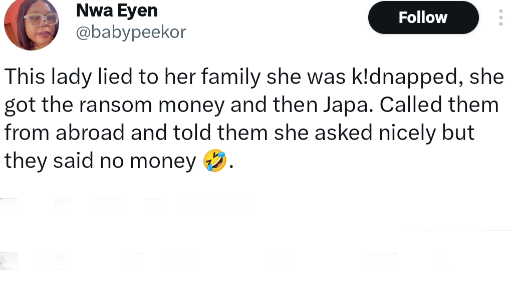 According to the post, the woman collected ransom money from her relatives and then used it to relocate abroad.