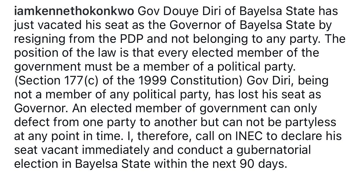 Politician Kenneth Okonkwo has urged the Independent National Electoral Commission (INEC) to immediately declare the Bayelsa State governorship seat vacant and conduct a new election in the state within 90 days.