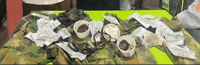Recovered items from the scene include a Nigerian military camouflage uniform, a battle axe, an assault dagger, various charms, and counterfeit foreign currency amounting to $3,000 in fake $100 bills.