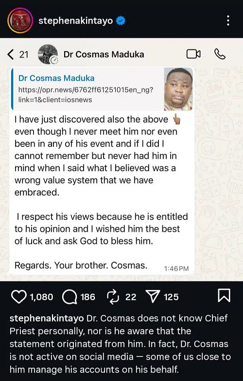 In a WhatsApp message shared on Instagram by Stephen Akintayo, chairman of Gtext Homes, on Wednesday, Maduka clarified that he had no personal issue with Cubana Chief Priest and did not mention him in his earlier remarks about Nigeria’s value system.