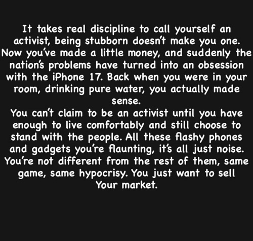 You can't claim to be an activist until you have enough to live comfortably and still choose to stand with the people. All these flashy hones and gadgets you're flaunting, it's all just noise. You're not different from the rest of them, same game, same hypocrisy. You just want to sell your market."