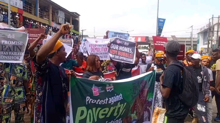 Hundreds of protesters have taken to the streets to protest against worsening hunger and ongoing on demolition of buildings in Oworonshoki.