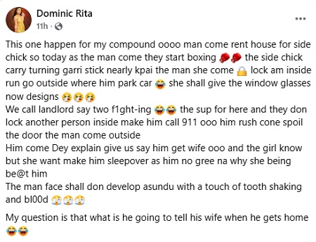 “This one happen for my compound oooo man come rent house for side chick so today as the man come they start boxing. The side chick carry turning garri stick nearly kpai the man she come lock am inside run go outside where him park car , she shall give the window glasses now designs,” she wrote.
