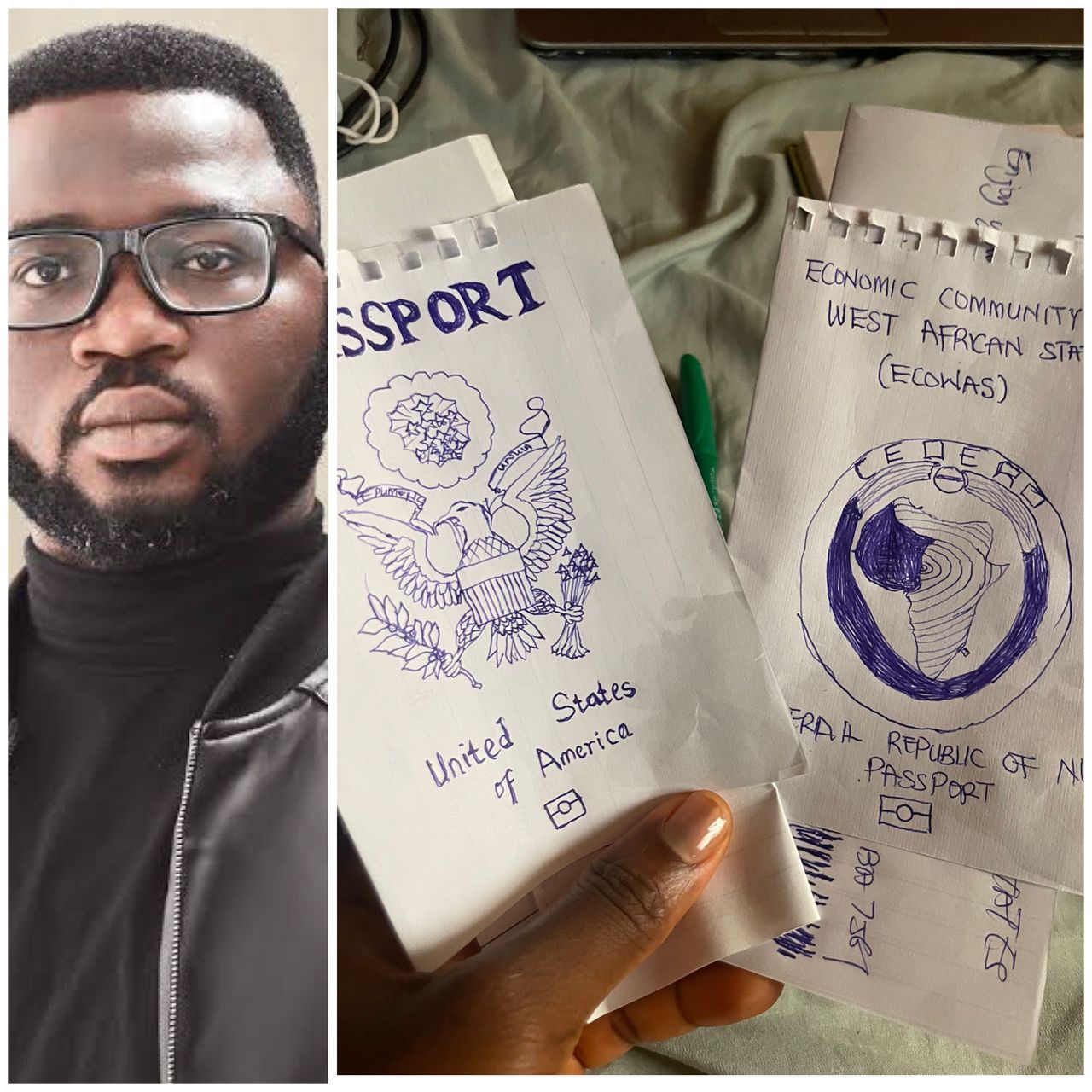 Last night, a Nigerian drew photos of the American passport and prayed that by this time next year, he would have become a citizen of the US and obtained his US passport.