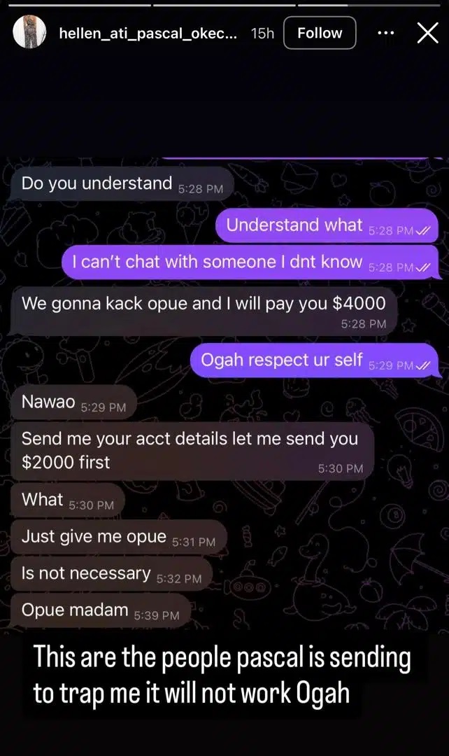 Hellen shared screenshots she alleged were part of a ploy to intimidate and manipulate her.