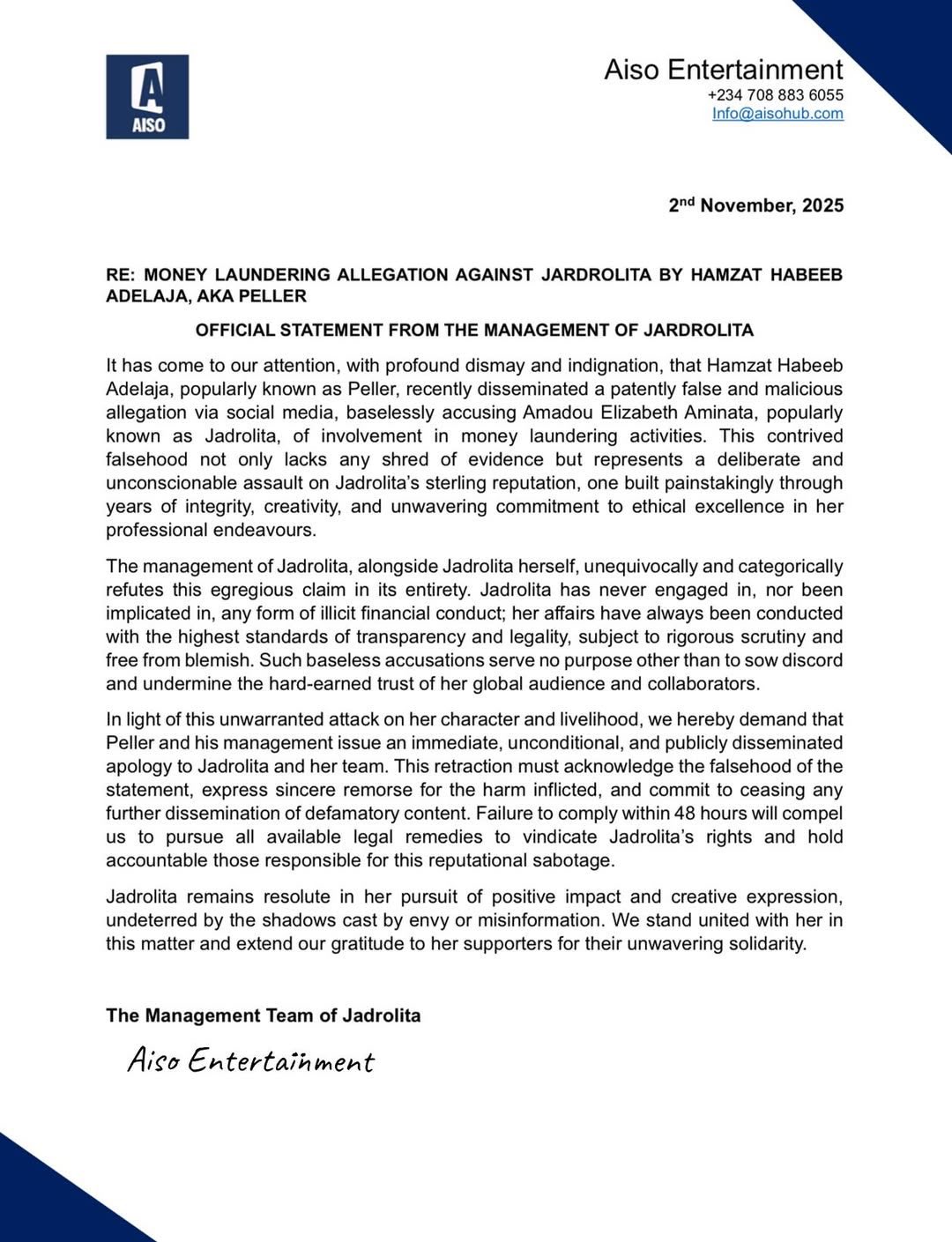 Jarvis, the popular Nigerian TikTok creator, has threatened legal action against fellow content creator Peller over allegations connecting her to money laundering activities on the platform.