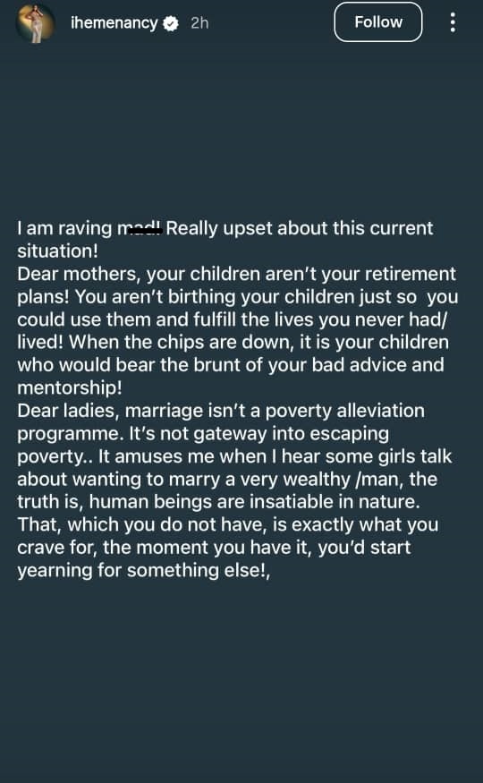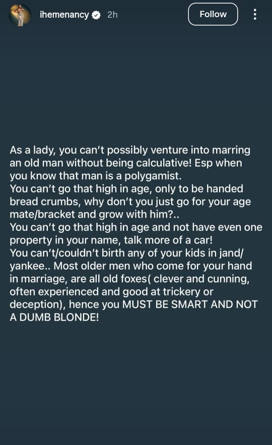 Nancy went on to advise women not to see marriage as a “poverty alleviation programme,” warning that some older men financially m@nipulate their wives to keep them dependent.
