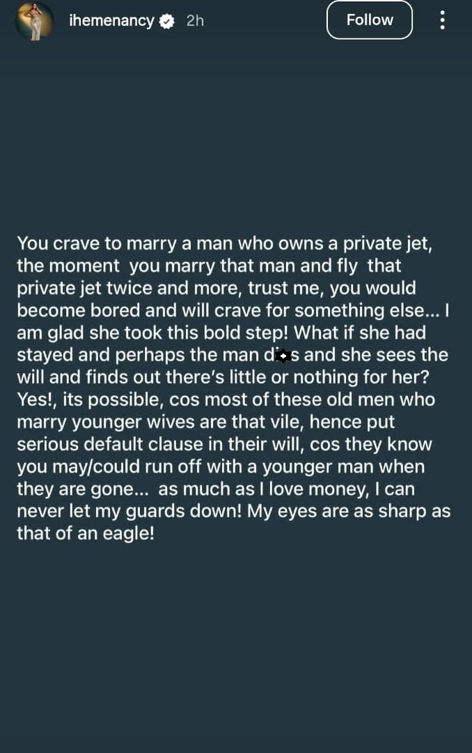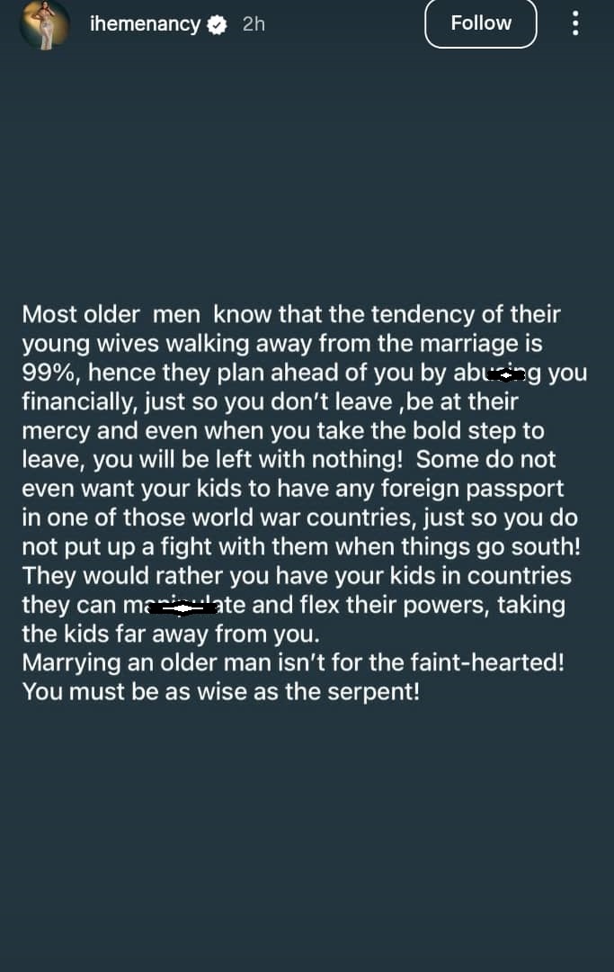 She added that marrying an older man “isn’t for the faint-hearted,” urging women to prioritise their happiness and walk away from relationships that no longer serve them.