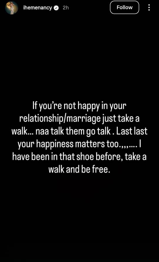 “If you’re not happy in your marriage, take a walk. Last last, your happiness matters too. I’ve been in that shoe before — take a walk and be free,” she concluded.