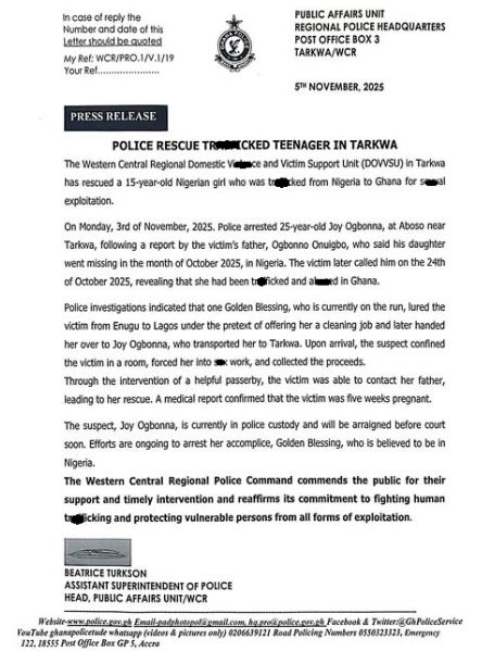 The suspect allegedly promised the teenager a cleaning job. Instead, she was handed over to Joy Ogbonna, who transported her to Tarkwa in Ghana.