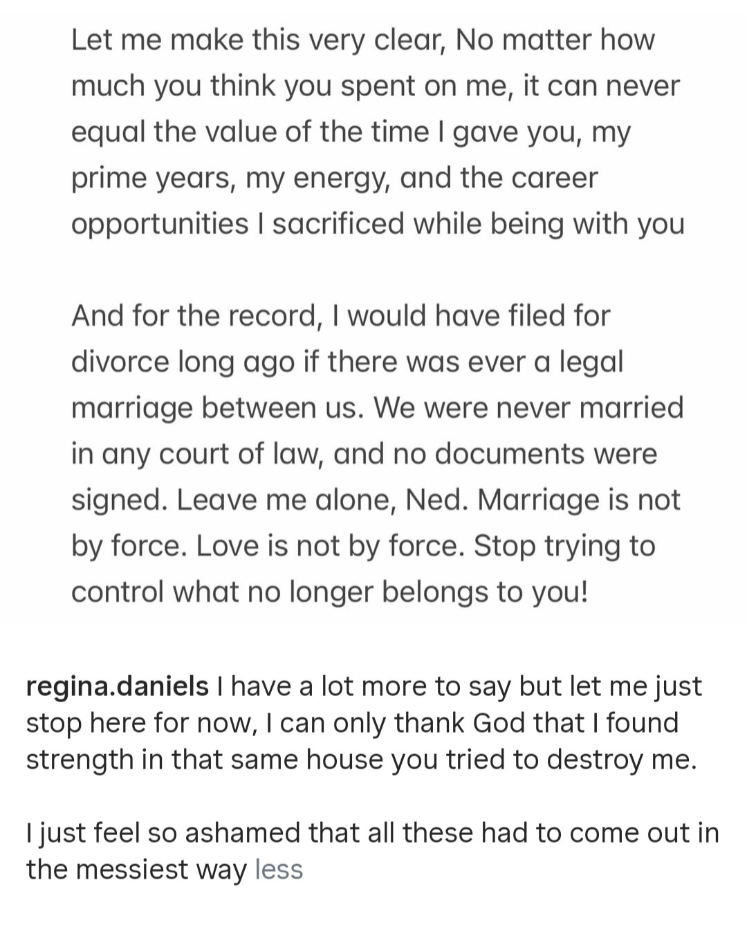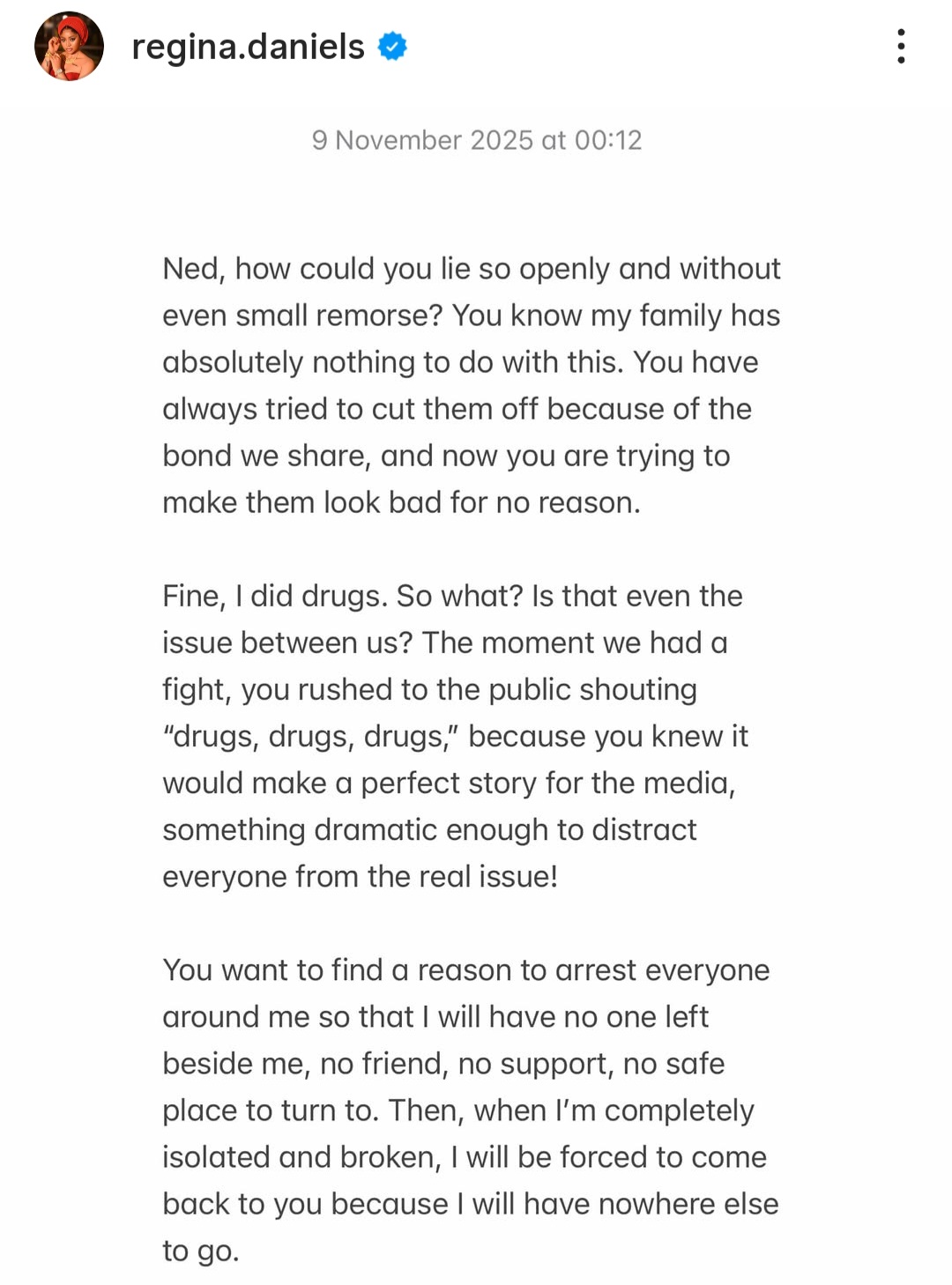 Actress Regina Daniels has fired back at her estranged husband, Ned Nwoko, accusing him of making damaging and false claims after he alleged in a statement that she and her siblings are drug addicts.