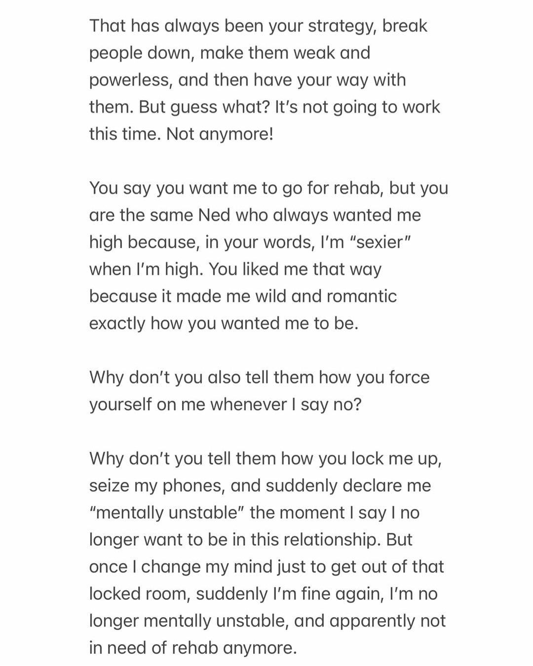 She admitted she takes drugs but alleged that Ned was the one who encouraged her to take it because, according to him it makes her "s*xier", "wild", and "romantic", "exactly how you wanted me to be."