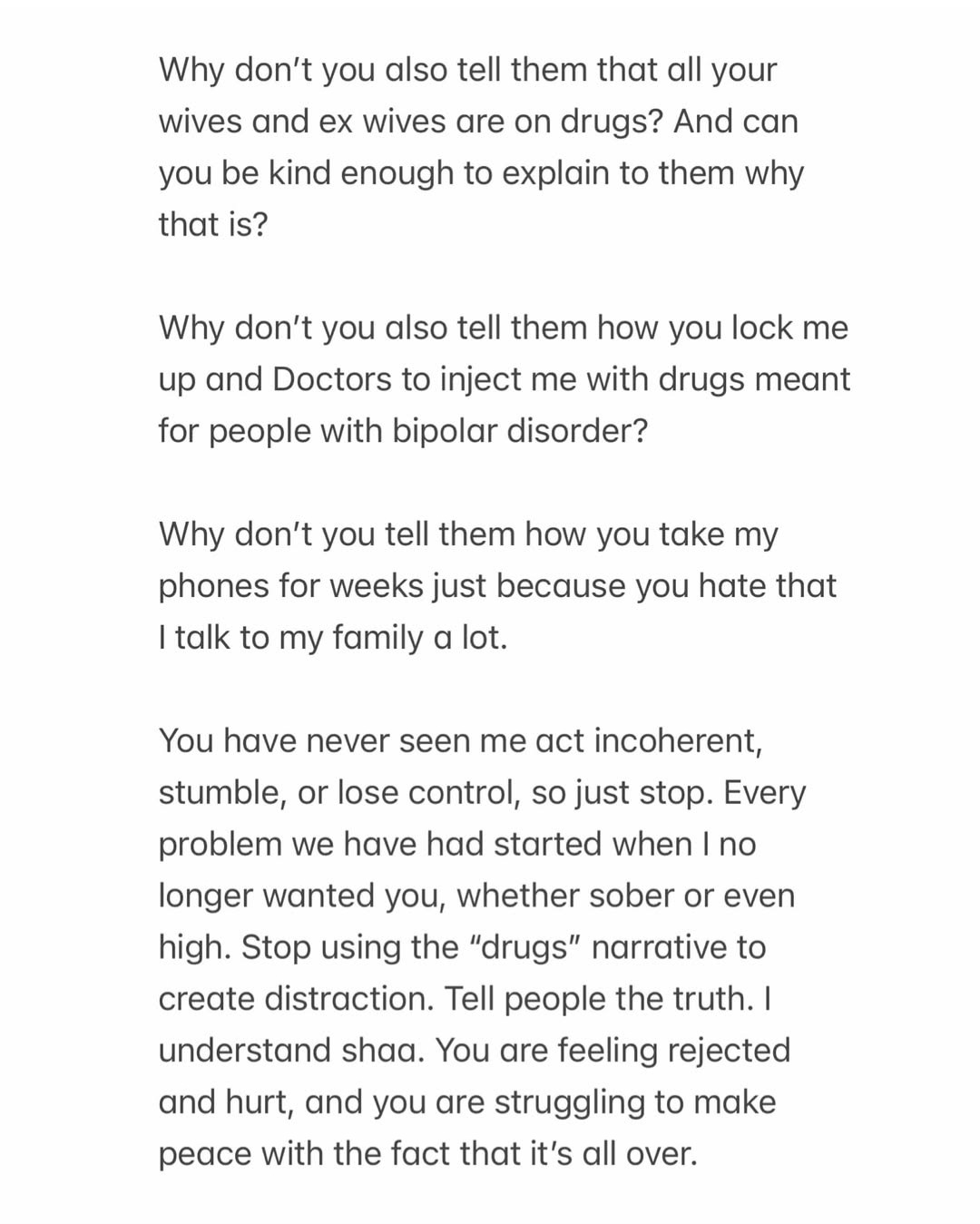 Regina also charged Ned to tell the world why all this wives and ex-wives are on drugs.