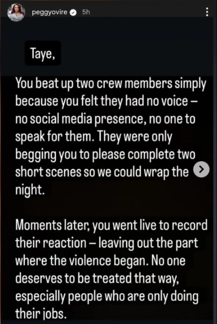 In her post, Peggy accused Taye of physically assaulting two crew members during a film shoot. According to her, the incident started when the crew pleaded with him to complete two short scenes so they could wrap up filming for the night.