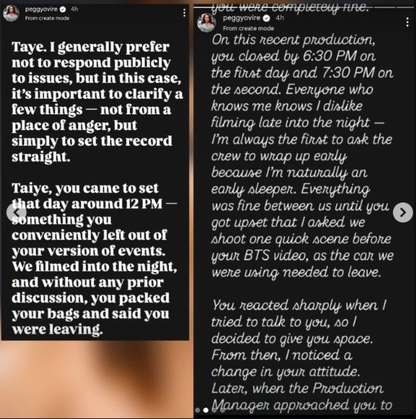 Nollywood actress Peggy Ovire has broken her silence on the ongoing dispute with actor Taye Arimoro, sharing her side of the story through a series of Instagram posts.