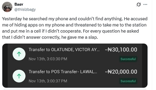 An X user while sharing his recent experience, alleged that he doled out N50, 000 to some officers who demanded he opened his phone and when they found nothing incriminating, accused him of hiding his incriminating apps.