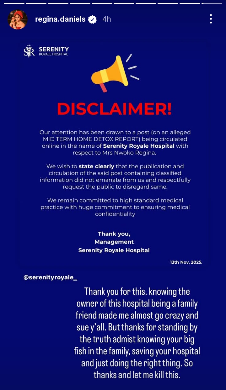 Nollywood actress, Regina Daniels has reacted publicly to a statement issued by Serenity Royale Hospital in Abuja.