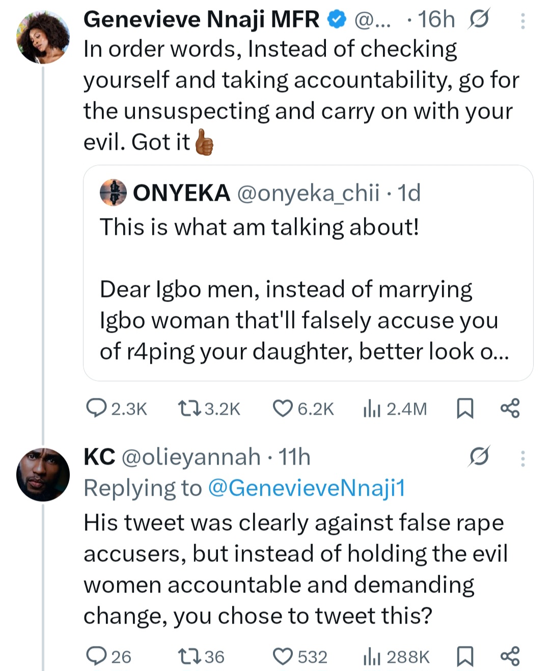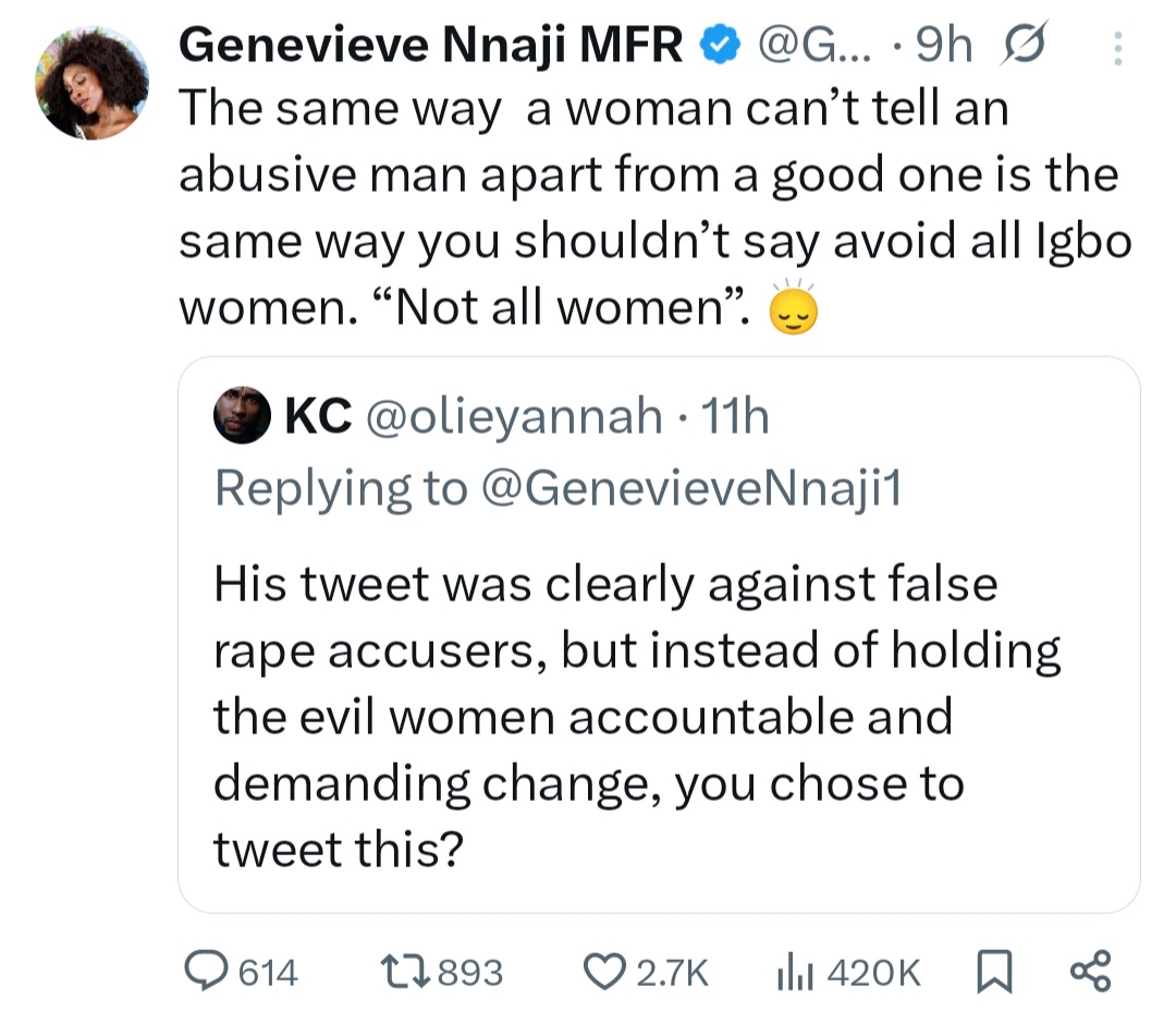 And the actress hit back, writing: "The same way a woman can’t tell an abusive man apart from a good one is the same way you shouldn’t say avoid all Igbo women. 'Not all women'."