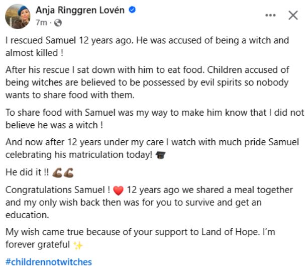 “I rescued Samuel 12 years ago. He was accused of being a witch and almost k1lled,” she wrote.