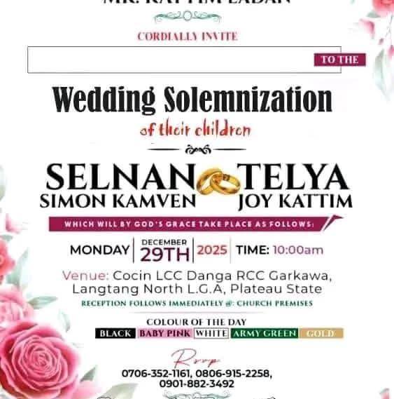 The couple's wedding was scheduled to hold on December 29, 2025 in Langtang North Local Government Area of Plateau State.