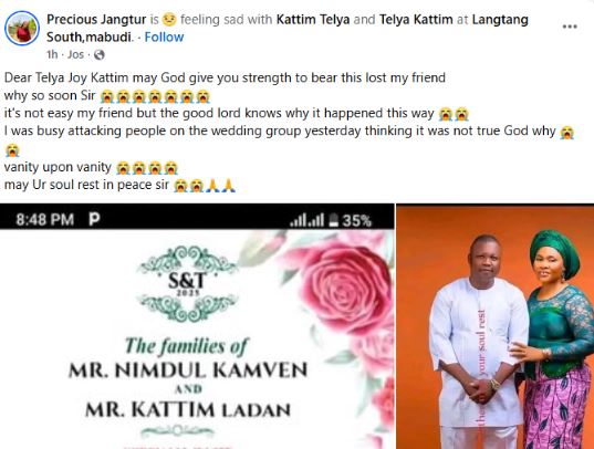 Danjuma Benjamin wrote: “Dear Kattim Telya, may God give you heart to bear this great loss, may He comfort you in a special way. Rest in peace brother.”