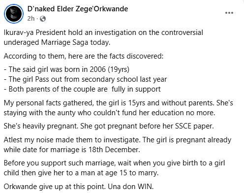 “Ikurav-ya President held an investigation on the controversial underaged Marriage Saga today. According to them, here are the facts discovered: The said girl was born in 2006 (19yrs). The girl passed out from secondary school last year.