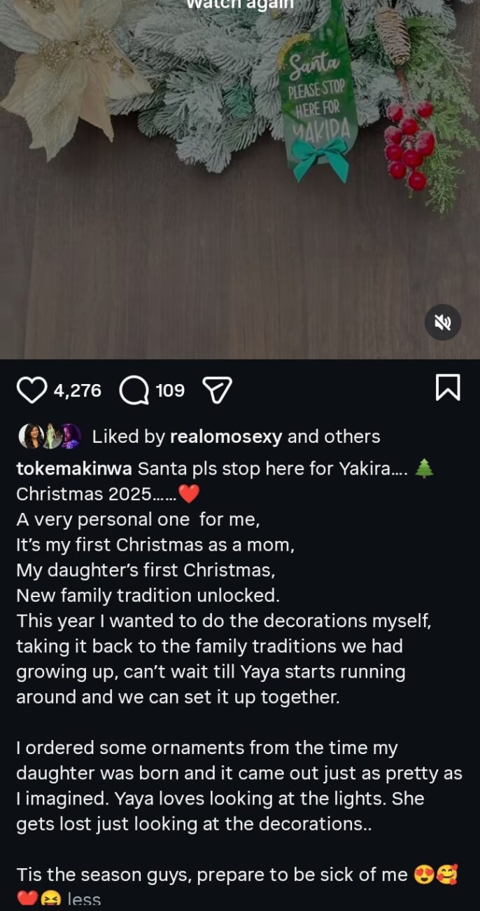 Toke Makinwa, the Nigerian media personality, is preparing to celebrate her first Christmas as a mother.