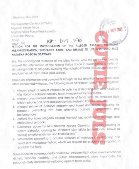 The family of Innocent Idibia, the Nigerian singer better known as 2Face Idibia or 2Baba, has filed a petition with the Inspector General of Police (IGP) against his wife, Natasha Osawuru.