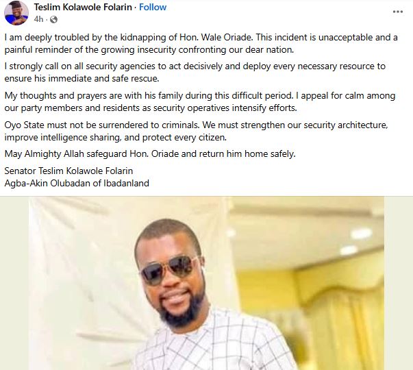 “I am deeply troubled by the kidnapping of Hon. Wale Oriade. This incident is unacceptable and a painful reminder of the growing insecurity confronting our dear nation” Folarin said