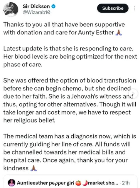 Popular Nigerian personal shopper, Aunty Esther, who is well known on X, has made headlines after new reports claimed she allegedly refused a doctor-recommended blood transfusion following her cancer diagnosis.