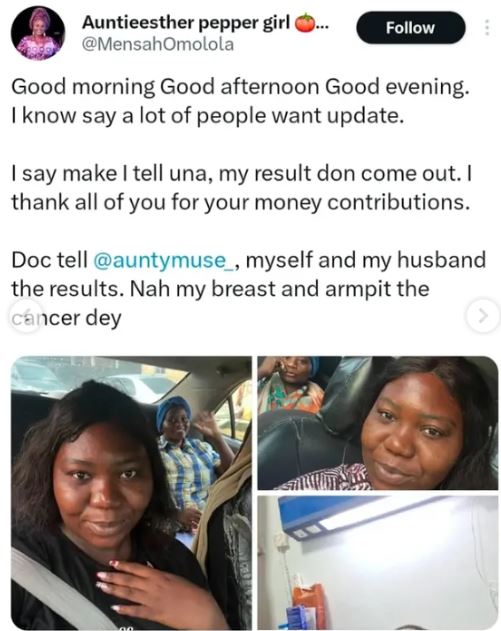 Aunty Esther has been diagnosed with cancer recently and had earlier informed her followers that her test results were out, confirming cancer in her breast and armpit. She also thanked everyone who contributed financially to her treatment.