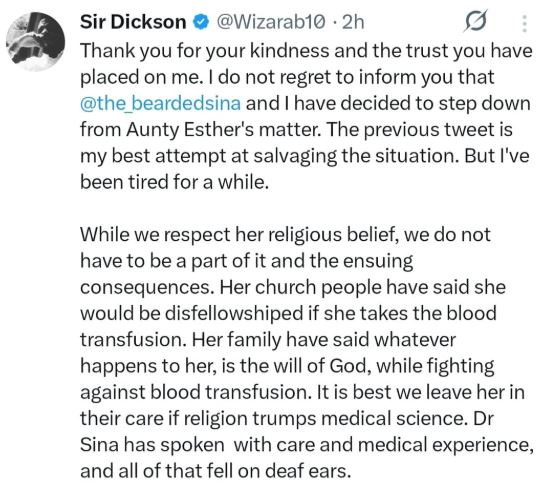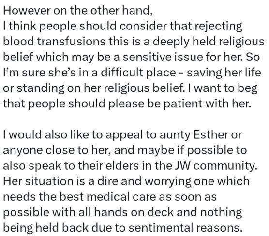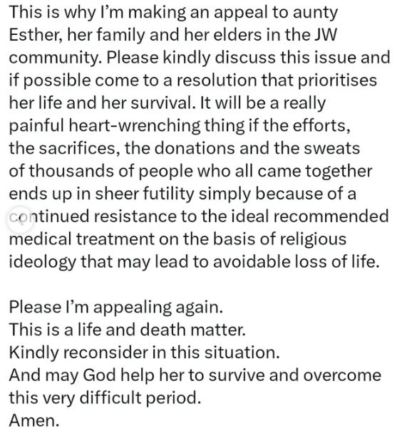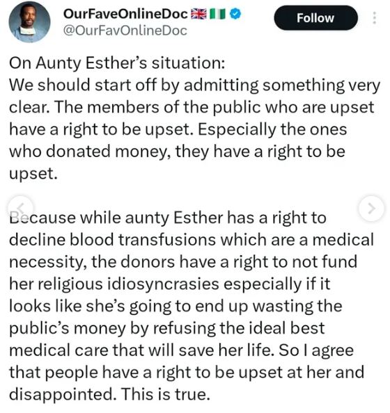 A popular online doctor also weighed in, saying people have a right to be upset. He noted that in a life-threatening situation, refusing the recommended treatment could lead to severe consequences, and appealed to Aunty Esther, her family, and her religious elders to reconsider the decision.