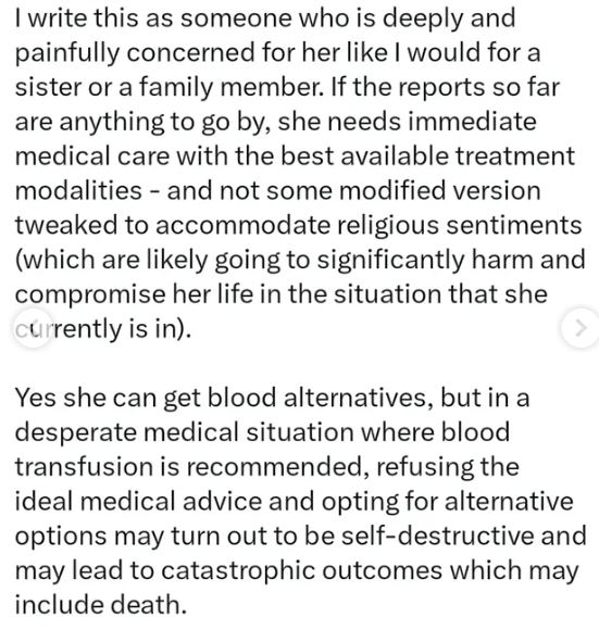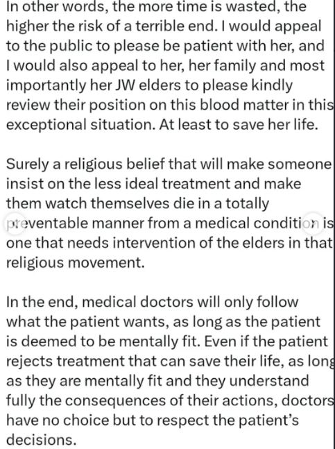 He added that her church allegedly warned she would be disfellowshipped if she accepted blood, and some family members insisted that “whatever happens is God’s will.”