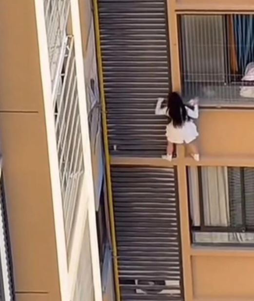 Residents in Guangdong province watched in disbelief as the woman dangled from a tenth floor balcony, appearing at moments to lose her grip.