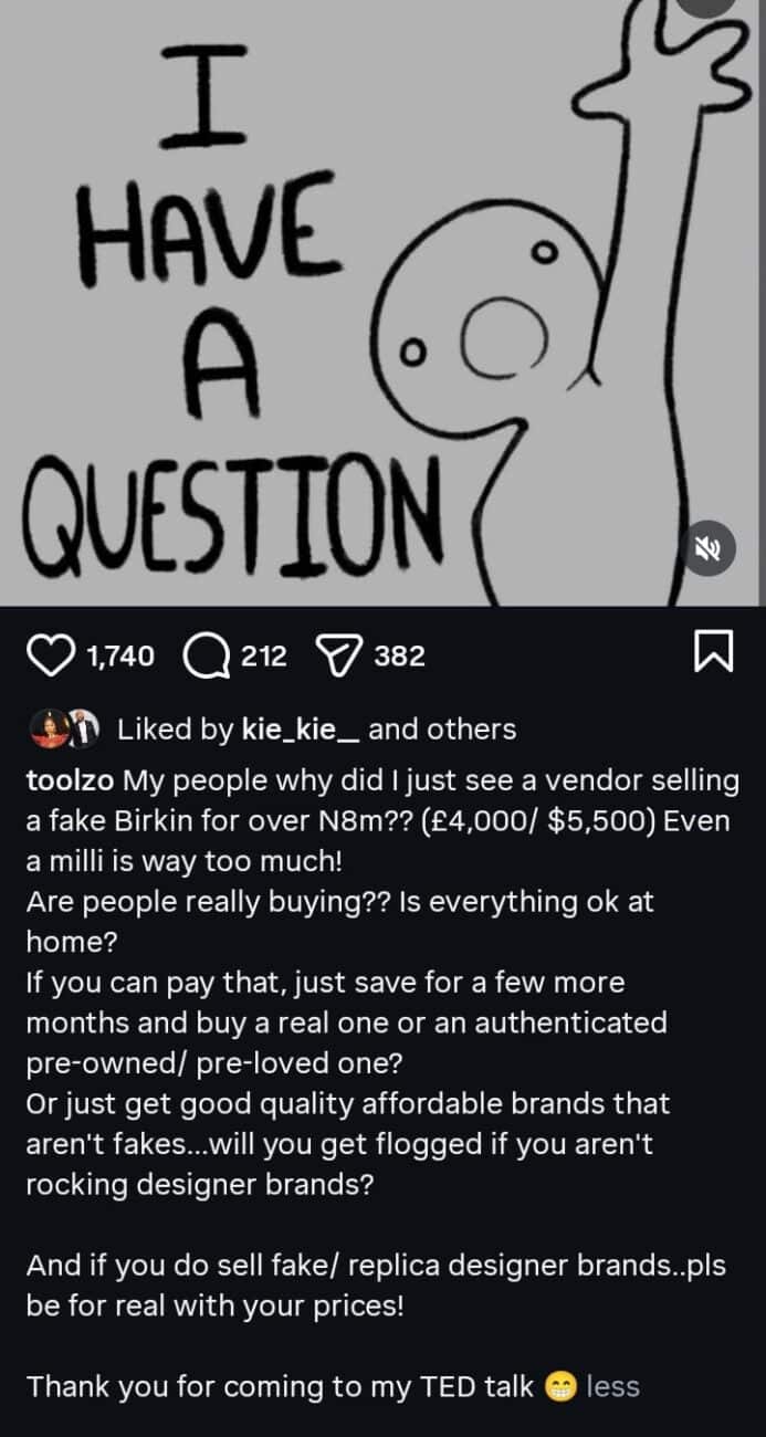 “My people, why did I just see a vendor selling a fake Birkin for over N8m?? (£4,000/ $5,500) Even a milli is way too much!