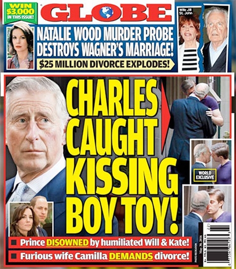 In a world exclusive story on a front page cover, The Globe magazine has disclosed that the Buckingham Palace is in shock and upset about facing a fresh 'gay' scandal after Prince Charles' secret gay life has been blown wide open by shocking photos of the love-sick royal in a sizzling lip-lock with his toy boy lover.