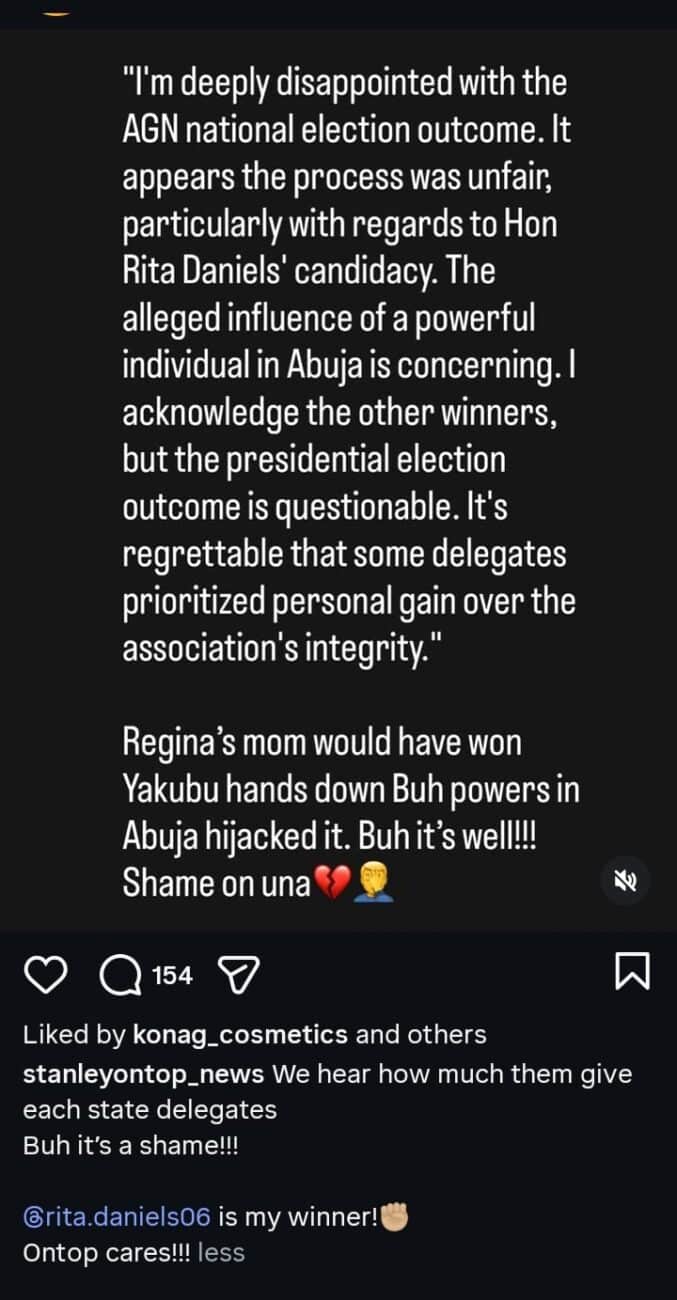 “I’m deeply disappointed with the AGN national election outcome. It appears the process was unfair, particularly with regard to Hon Rita Daniels’ candidacy. The alleged influence of a powerful individual in Abuja is concerning.