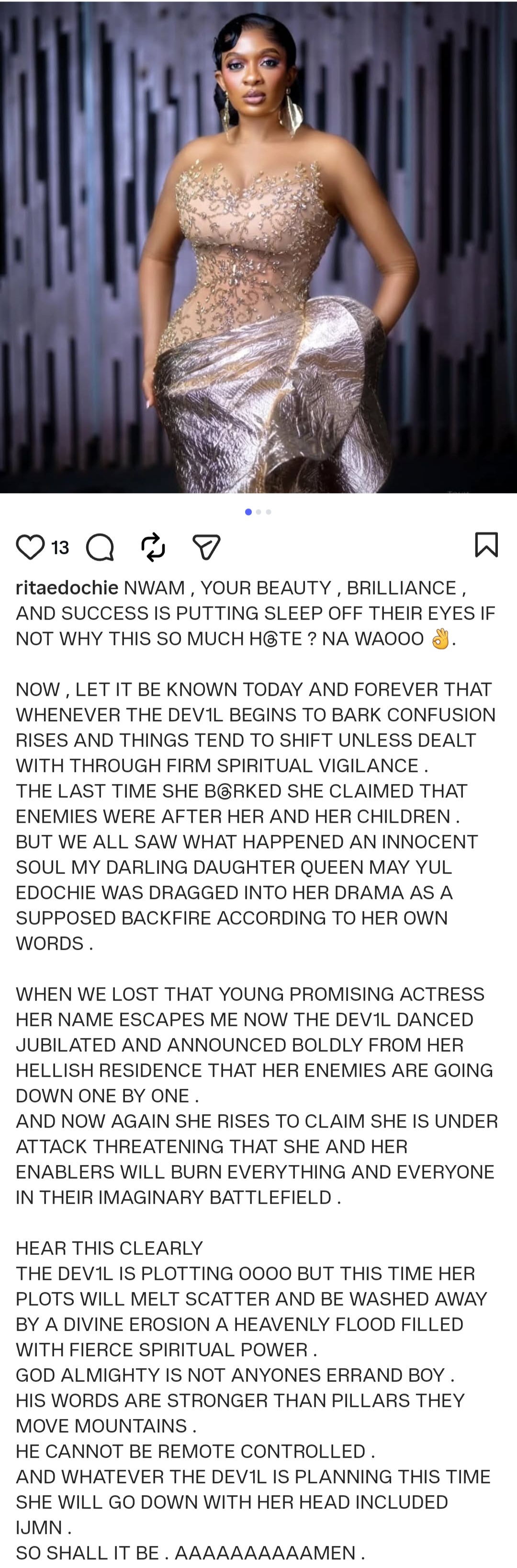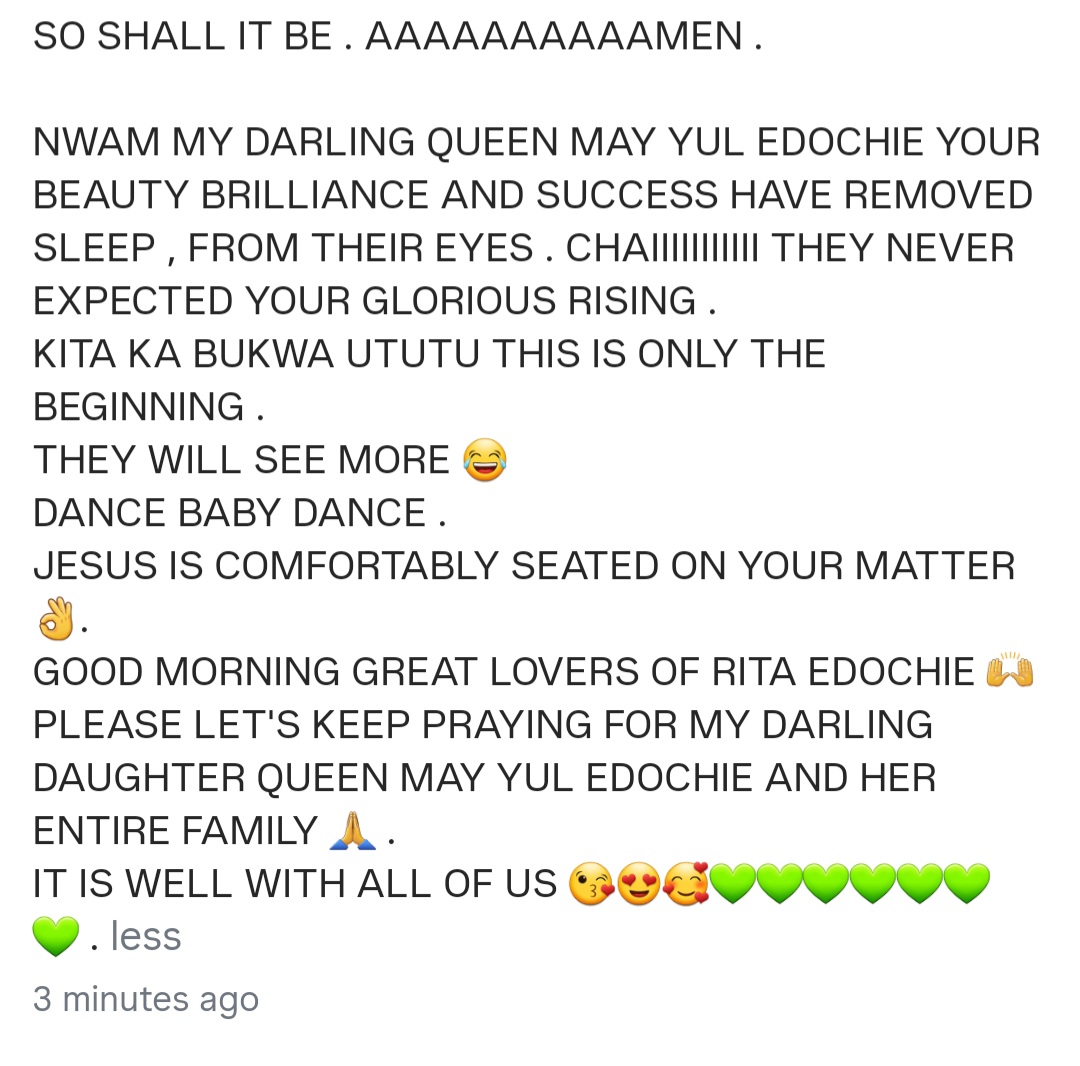 Today, Rita Edochie took to Instagram to share a message in support of May Yul Edochie, who was previously married to Yul Edochie before Judy Austin reportedly became pregnant for him and he subsequently married her.