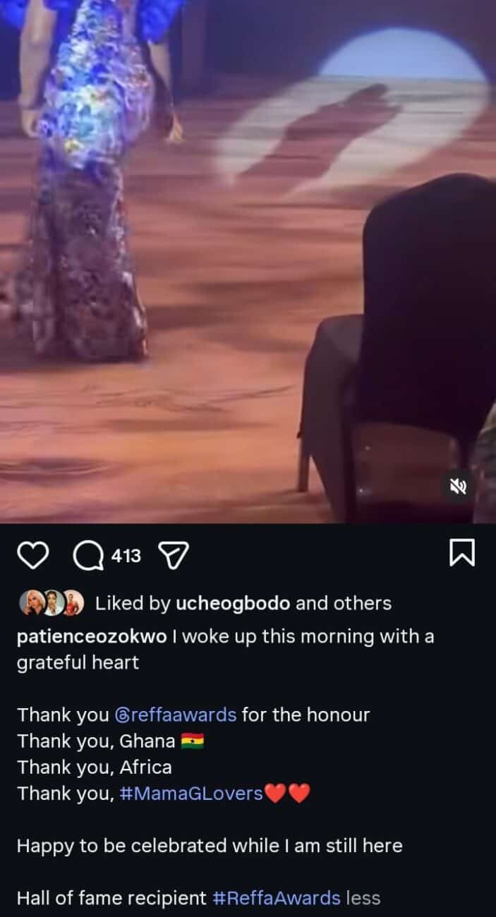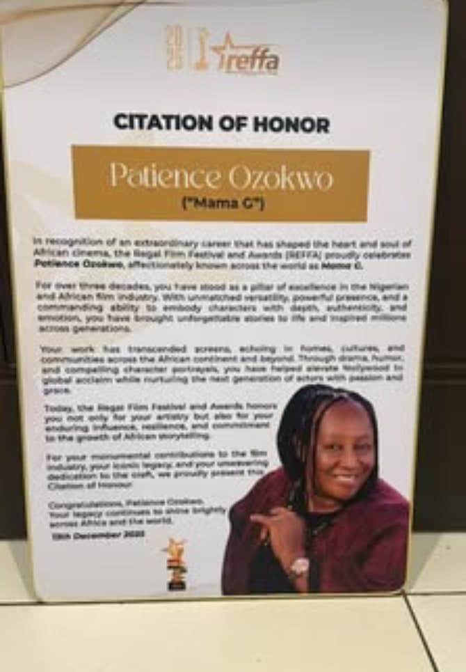 Veteran Nollywood actress Patience Ozokwo has expressed her gratitude after being honoured with a Hall of Fame award in Ghana.