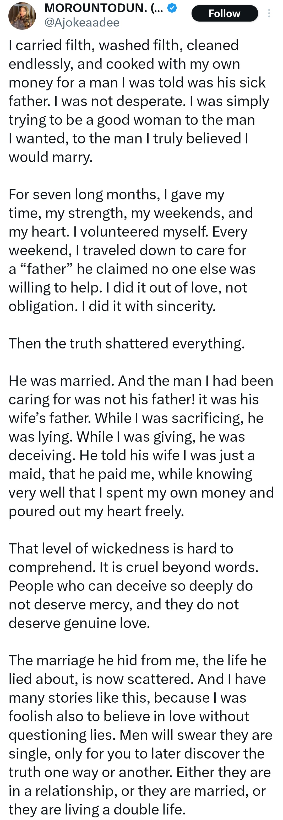 She shared on X: "I carried filth, washed filth, cleaned endlessly, and cooked with my own money for a man I was told was his sick father. I was not desperate. I was simply trying to be a good woman to the man I wanted, to the man I truly believed I would marry.