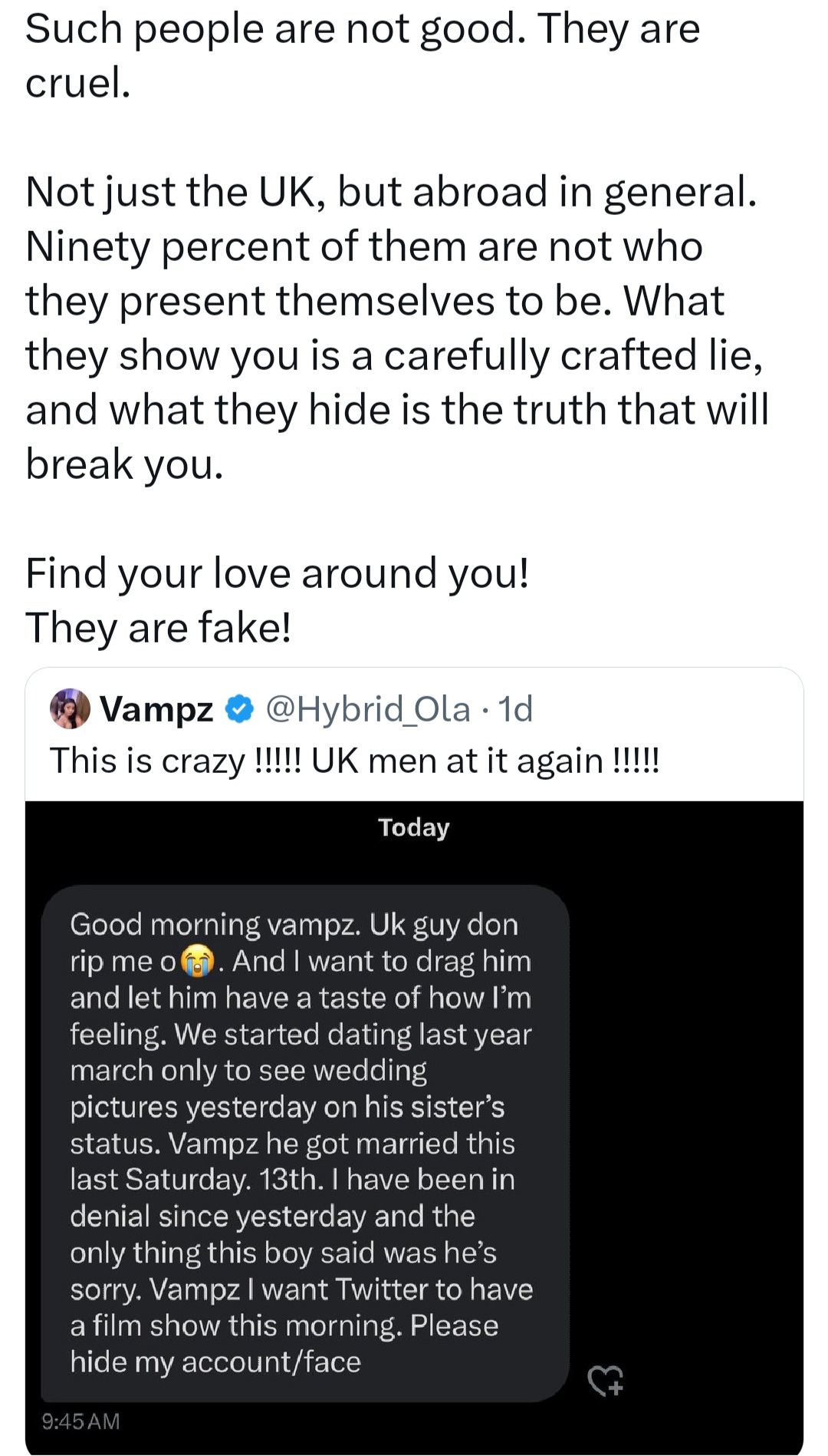 "Not just the UK, but abroad in general. Ninety percent of them are not who they present themselves to be. What they show you is a carefully crafted lie, and what they hide is the truth that will break you.