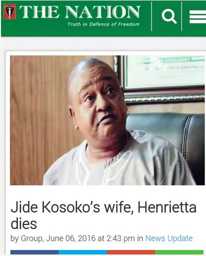 Nollywood actress, Henrietta Kosoko, wife of veteran actor, Jide Kosoko is dead. She died on Monday morning, 6th of June, 2016.