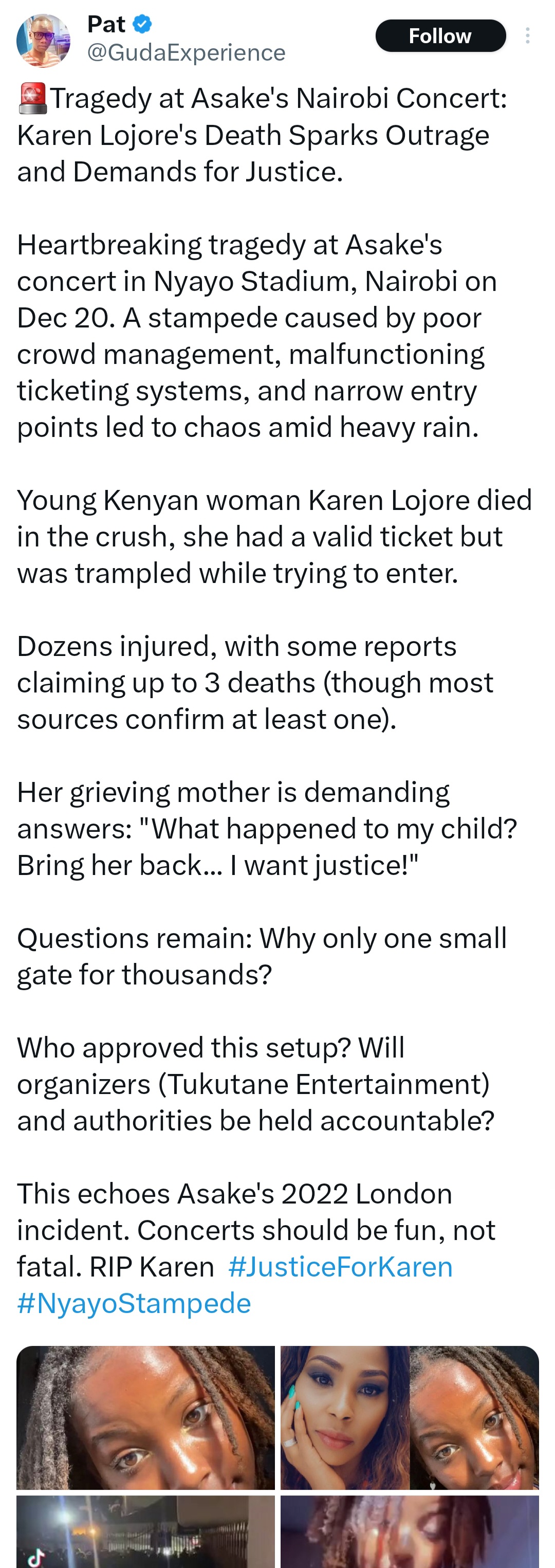 Many angry Kenyans had taken to the social media platform X to announce the de@th of Karen Lojore.