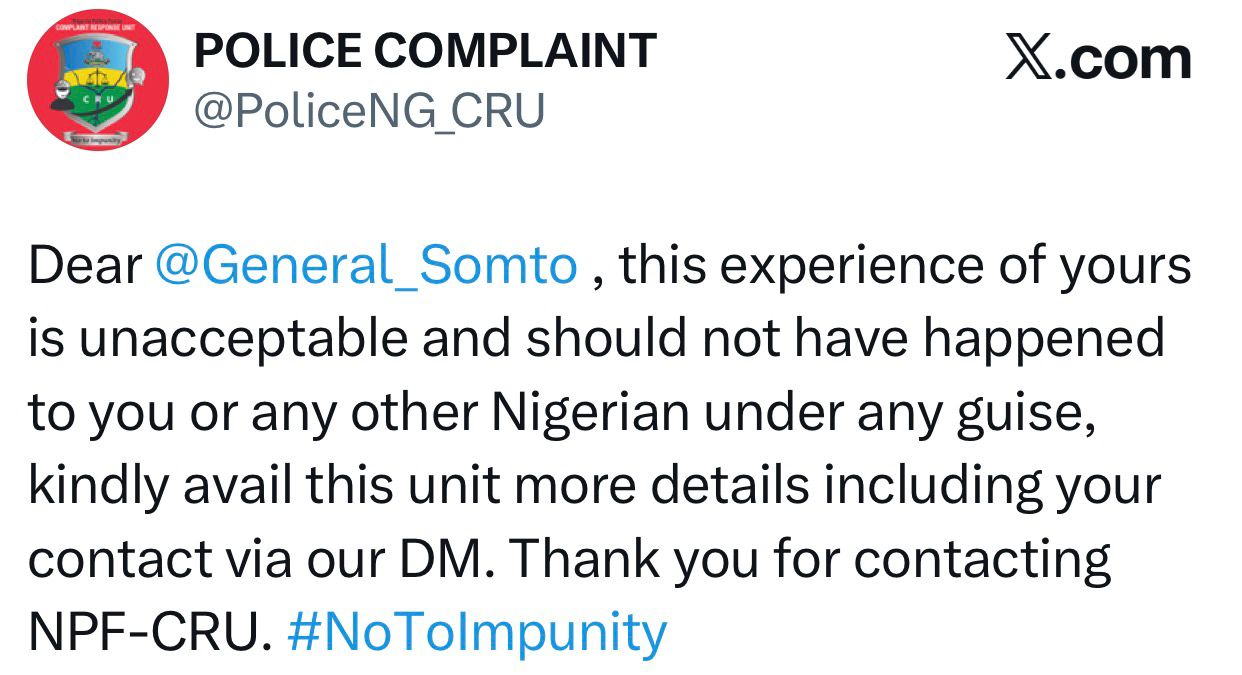 It wrote: ‘’This experience of yours is unacceptable and should not have happened to you or any other Nigerian under any guise, kindly avail this unit more details including your contact via our DM. Thank you for contacting NPF-CRU. #NoToImpunity''
